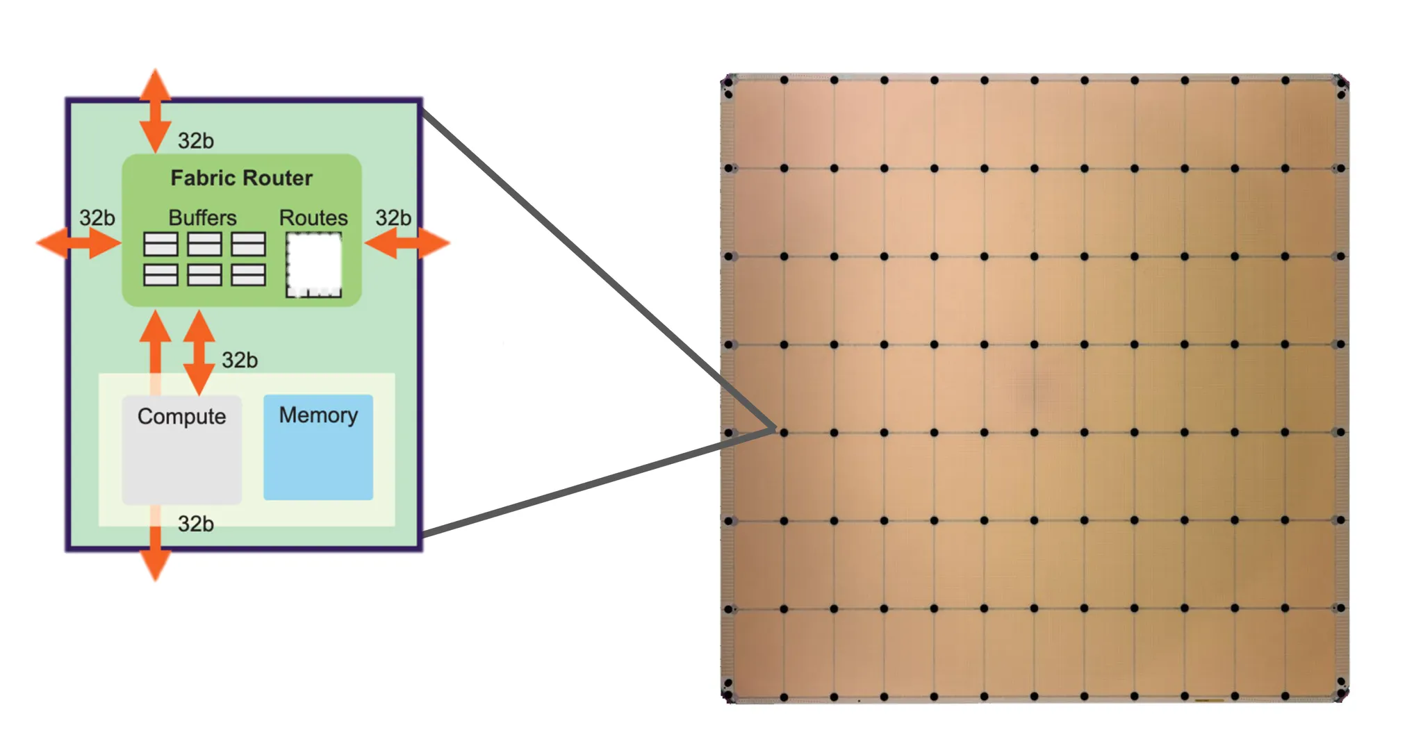 Each core in the WSE has its own high-performance compute capabilities, tightly integrated with 48kB of SRAM memory and a 512B local cache. This direct integration ensures sufficient bandwidth to achieve full SIMD performance and reduces the need for off-chip data transfers.