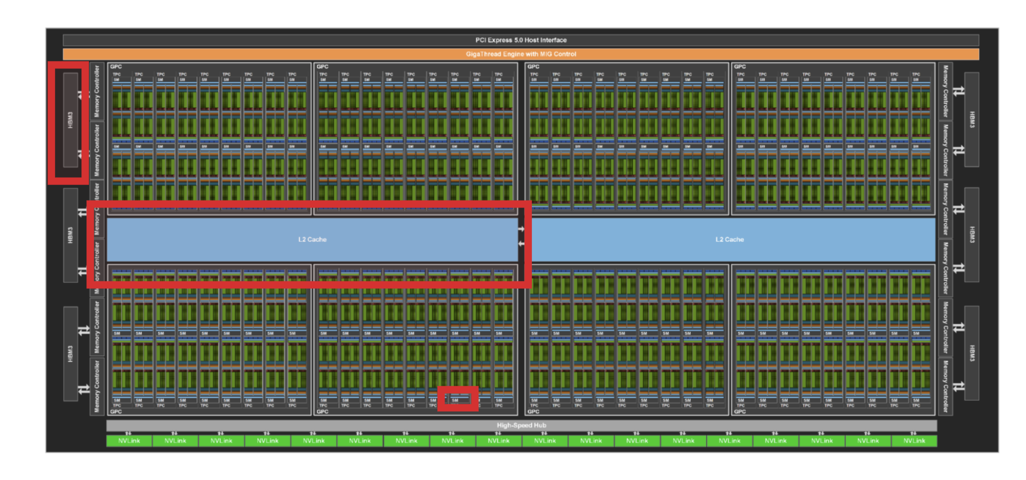 This setup includes a small, fast on-chip cache (L1), a slightly larger but slower L2 cache, and high-bandwidth memory (HBM) for off-chip storage. While effective in some scenarios, scaling to larger AI models introduces complexity and latency as the frequent data transfers between these memory levels—particularly between the L2 cache and HBM—become bottlenecks. This limits the available memory bandwidth, making it harder to sustain performance as models grow in size and demand more memory resources.