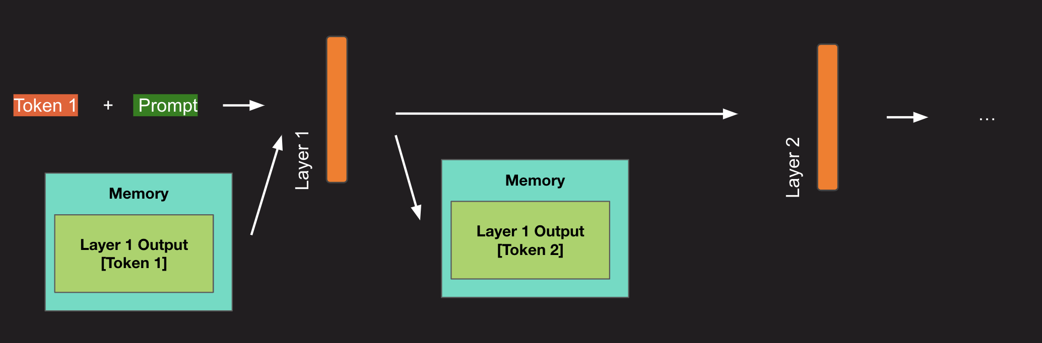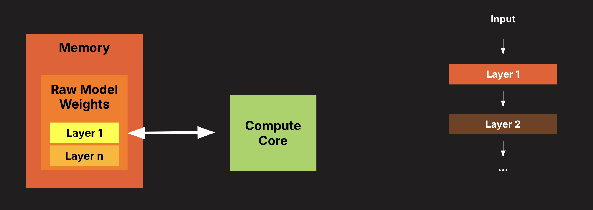 To generate each token, all model weights must be transferred from memory to the compute cores for each layer of the model. This movement occurs layer by layer and is repeated for every token, making the process inherently sequential and highly reliant on memory bandwidth.