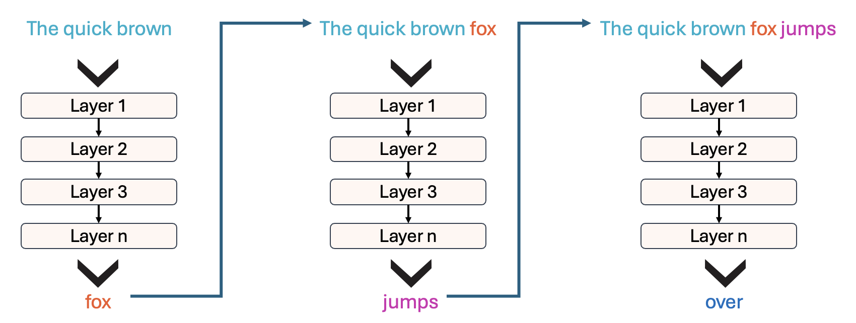 For instance, to generate the response "The Quick Brown Fox Jumps", the model generates a response one token at a time by passing the input through multiple layers of computation, each building on the previous.