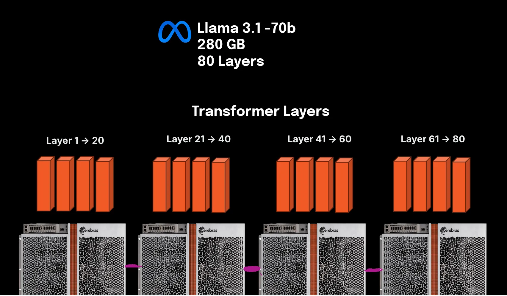 Models that need more memory are mapped across multiple wafers. Llama 3.1-70B, for example, fits on 4 wafers, providing 176 GB of memory. The high-bandwidth fabric on each wafer minimizes communication to just transferring activations, keeping latency low.