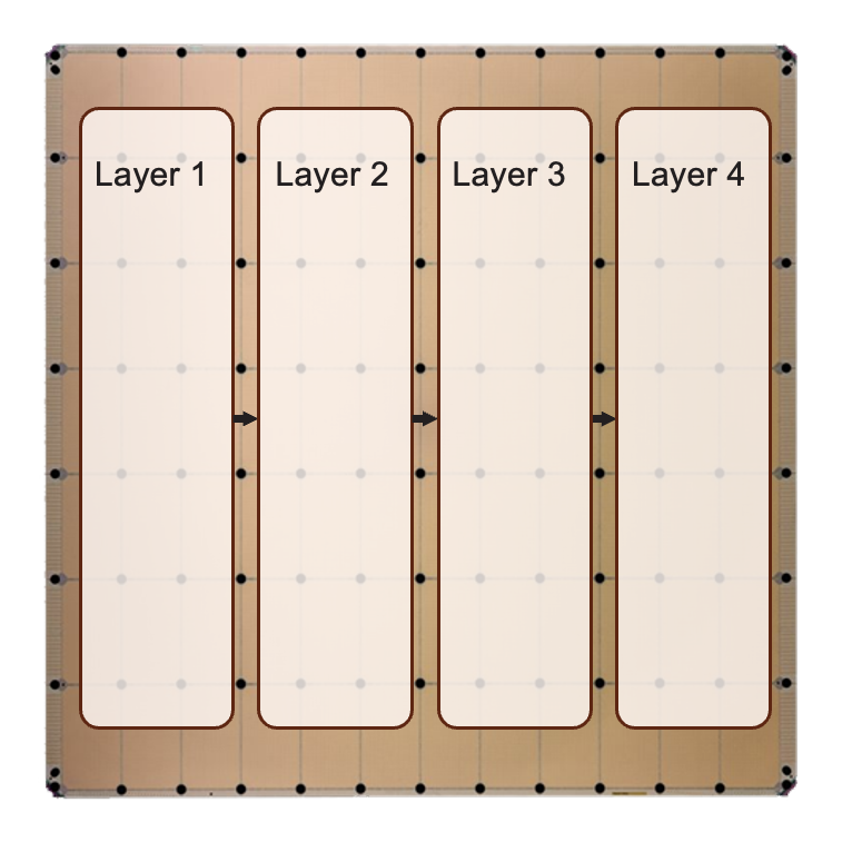 In Cerebras' pipelined execution for AI inference, model layers are mapped onto different regions of the wafer. Each region on the wafer is responsible for executing one or more model layers, with the region size dynamically determined based on memory and compute requirements. The on-chip fabric interconnect allows ultra-low latency communication between regions, with logically adjacent pipeline stages placed next to each other to further reduce latency.