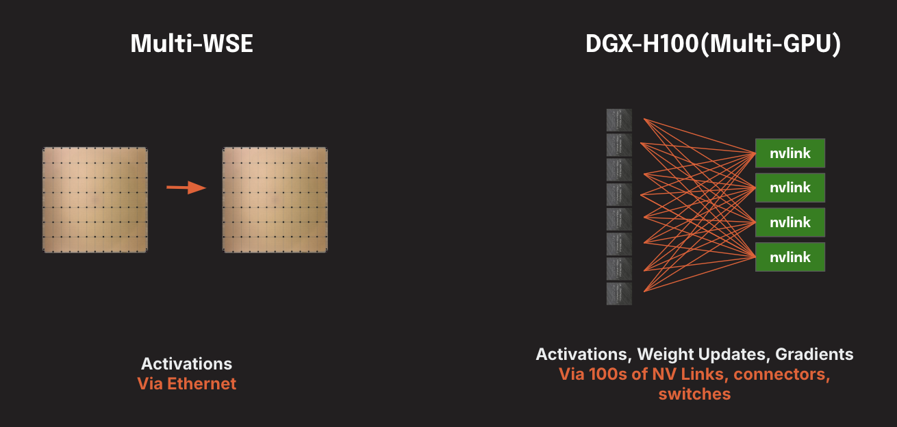 In traditional GPU setups, data must move through SerDes serial links, connectors, circuit boards, and switch chips, introducing significant latency. In contrast, moving bits less than a millimeter on silicon within the WSE is far more efficient. As a result, the WSE architecture increases memory bandwidth and avoids the bottlenecks GPUs face.